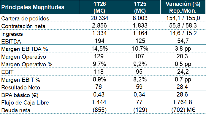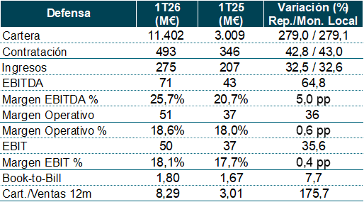 La cartera en el primer trimestre de 2026 alcanzó los 20.334 M€, aumentando un 154% respecto a los mismos meses de 2025, impulsada principalmente por Defensa (más de 8.394 M€) y por la contribución inorgánica de Espacio (consolidación de Hispasat e Hisdesat de 2.704 M€), y con todas las demás divisiones aportando también crecimiento. La ratio de cartera sobre ventas de los últimos doce meses se situó en 3,61x versus 1,64x mismo periodo del año anterior.