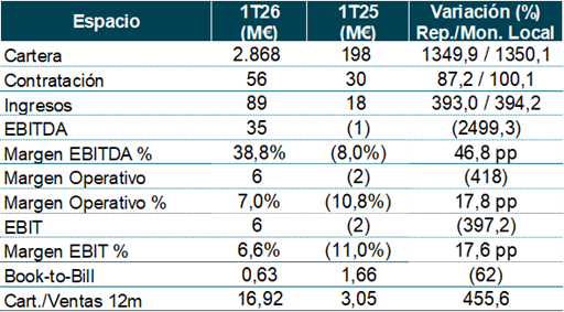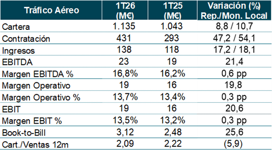 Las adquisiciones han aportado 109 M€ en las ventas del 1T26 vs 1 M€ en el 1T25. En Defensa han contribuido inorgánicamente las adquisiciones de TESS Defence y AERTEC, en Espacio han contribuido Hispasat e Hisdesat, y en ATM han contribuido Micronav y Global ATS.