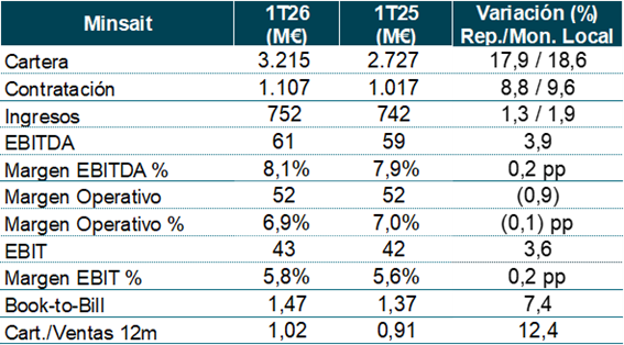La contratación neta en el primer trimestre de 2026 aumentó un 56%, con un fuerte crecimiento en todos los negocios, destacando Movilidad (que creció un 422%), principalmente impulsada por el contrato de gestión de la red de transportes de Londres en Reino Unido (605 M€ del proyecto Transport for London) y el contrato de sistemas ferroviarios en Arabia Saudí (107 M€ del proyecto AVE La Meca-Medina). Por su parte, la contratación en Espacio ascendió un 87% gracias a América, por el negocio de servicios en Perú de Hispasat y por Hisdesat. En ATM (aumento del 47%) con América (contrato de radares de vigilancia con la FAA en Estados Unidos), AMEA (contrato de fabricación de radares para el aeropuerto de Emiratos Árabes Unidos) y España presentando crecimientos de doble dígito. En cuanto a Defensa, creció un 43%, principalmente por la fuerte contribución del negocio de Simulación (Programa Especial de Modernización de sistema avanzado integrado de entrenamiento de vuelo como subcontratista de Airbus), los Programas Especiales de Modernización y el proyecto FCAS internacional. Y, por último, Minsait registró un aumento del 9% gracias a los crecimientos del 58% registrados por AAPP y Sanidad, así como por Servicios Financieros (creció un 5%). La ratio book-to-bill de contratación sobre ventas se situó en el 2,14x frente a 1,57x en el primer trimestre de 2025.