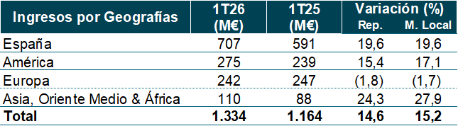 Los ingresos crecen un 15% en el periodo frente al primer trimestre de 2025, con incrementos interanuales en todas las unidades, destacando los crecimientos de dos dígitos de Defensa y ATM