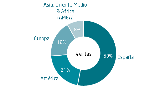 Los ingresos por geografías presentaron crecimientos en AMEA (del 24%; el 8% de las ventas totales), España (un 20%; 53% de las ventas totales) y América (el 15%; 21% de las ventas totales), en contraposición a los descensos registrados en Europa (que descendió un 2% y equivale al 18% de las ventas totales).